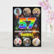 Die Vorderseite dieses aufregenden und optimistischen Geburtstagskarten-Designs zeigt eine große Zahl "57" mit einem vielfarbigen Regenbogenspektrum inspirierten Farbverlaufsmuster, zusammen mit der Meldung "HAPPY 57. BIRTHDAY" und einem individuelle Name, auf einem farbenfrohen Feuerwerk inspiriert Muster. Oben und unten auf der Vorderseite sind Bilder, die individuell angepasst werden können, vielleicht mit Fotos der Familie und Freunde des Empfängers. Die Innenseite hat eine individuelle Geburtstagsgrüßnachricht, oder könnte gelöscht und leer verlassen werden, wenn eine Nachricht von Hand geschrieben werden soll. Eine fröhliche, maßgeschneiderte Geburtstagskarte wie diese kann dazu verwendet werden, jemandes siebenundfünfzigsten Geburtstag zu feiern. (Fotografie © Storytree Studios, Stanford, CA.) [~Z000660]