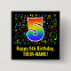 Dieses lustige, lebendige und farbenprächtige Geburtstagsknappendesign zeichnet sich durch eine große Zahl "5" mit einem inspirierten Regenbogenspektrum-Farbverlauf aus, sowie durch die Meldung "Happy 5th Birthday" und einen benutzerdefinierbaren Namen. Ein Teil des Hintergrundes hat farbenfrohe Musiknoten und Symbolmuster. Es kann sein, dass die Gäste bei einer Geburtstagsparty, die zum fünften Geburtstag von jemandem gefeiert wird, solche aufbearbeitbaren Geburtstagsknöpfe tragen. [~Z0000424]