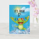 Grüner Frosch mit Geburtstagsbanner, der aus blauem Wasser auf Himmelshintergrund springt, für den 5. Geburtstag eines Kindes.