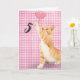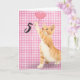 Goldkatze mit rosa Herzballon zum 5. Geburtstag auf rosa und weißem Gingham Hintergrund.