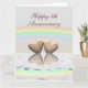 Zwei hölzerne Herzen schwimmen unter einem Regenbogen auf dem Wasser. Im Text steht "Happy 5th Anniversary" mit Vers im Inneren.