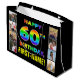 Dieses fröhliche und kühn gebliebene Geschenktütendesign beinhaltet die Meldung "HAPPY 60TH BIRTHDAY", mit dem Text mit einem farbigen Regenbogenspektrum, inspiriert Farbverlaufsmuster und einem benutzerdefinierten Empfängernamen. Auf der Vorderseite sind einige Foto, die links und rechts von der Regenbogen-gemusterten Botschaft sind, die personalisiert sein können, vielleicht mit Fotos des Empfängers, der Familie und Freunden des Empfängers und/oder dem/den Absender(en) des Geschenks. Eine lustige Geburtstagsgeschenktüte wie diese kann bei einem Geschenk zur Feier des sechzigsten Geburtstages verwendet werden. (Fotografie © Storytree Studios, Stanford, CA.) [~Z000668]