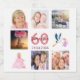Ein Flaschenetikett für eine 60. Geburtstagsfeier, die ihr Leben mit einer Collage von 8 deiner Fotos feiert. Vorlagen für einen Namen, 60 Jahre und ein Datum. Geburtsdatum oder Geburtsdatum des Party. Korallen- und Bordeaux-Buchstaben. Weißer Hintergrund.