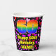 This fun and colorful birthday paper cup design features a large number “60” having a rainbow spectrum gradient inspired pattern. It also features the message “Happy 60th Birthday,”, and a custom name. The background features a pattern of purple, red, and pink heart shapes of various sizes. Loving, fun paper cups like this might be fun to use at a birthday party being held in celebration of somebody’s sixtieth birthday. [~Z0000548]