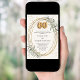 A soft ivory background. A faux gold looking frame decorated with sage green greenery and faux diamonds. Personalize and add your names, details. Black text.