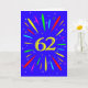 Eine explosive 62. Geburtstagskarte! Was für eine wunderbare Art, Geburtstagsgrüße zu schicken. Die Zahl 62 in hellgelb mit einer Explosion von hellen Farben und Sternen.