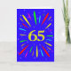 Eine explosive 65. Geburtstagskarte! Was für eine wunderbare Art, Geburtstagsgrüße zu schicken. Die Zahl 65 in hellgelb mit einer Explosion von hellen Farben und Sternen.