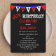 Diese lustige und moderne 65. Geburtstagsfeier lädt mit rot-weißen Fahnen auf schwarzem Hintergrund zum Verweilen ein. Auf den Fahnen die Buchstaben H A P Y sind glücklich. Unter den Flaggen erscheinen die Worte "65. Geburtstagsfeier". Ihre Geburtstagsparty-Details können Sie unten anpassen. Das ist eine großartige moderne Einladung zu einer 65. Geburtstagsfeier. Copyright henishouseuse paper