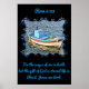 Rom 6:23 Denn der Lohn der Sünde ist der Tod, aber die Gabe Gottes ist das ewige Leben in Christus Jesus unser Herr. Auf einem Poster mit einem alten Boot im ruhigen Ozean und einem hellblauen Rahmen.Realistische Kunstwerke aus Ölgemälden.