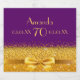 Elegant, klassisch, glamourös und feminin für eine 70. Geburtstagsfeier. Ein goldfarbenes Band und Bogen. Lila Hintergrund. Vorlagen für einen Namen, 70 Jahre, Geburtsdatum, Geburtstag, Jahrestag und Altersnummer. Goldene Buchstaben.