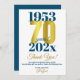 Une carte de remerciement moderne et frappante pour 70e anniversaire. Cette carte spéciale d'anniversaire de jalon consiste en la date de naissance et d'anniversaire en typographie bleue - avec les 70 mis en surbrillance dans une police d'effet or. Ajoutez un message pour un cadeau de fête personnalisé merci.