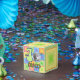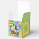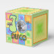 Viereckige, klassische Gefälligkeitsbox mit einem Vorder- und Rückseite-Bild, einer glänzenden Disco-Kugel, ein Grundnahrungsmittel des 70er, auf einem farbenfrohen pastellfarbenen Hintergrund mit fuchsienfarbenen, orangen, blauen, grünen, lila und gelben Quadraten. Die Seiten und die Oberseite haben ein Bild eines gelben Quadrats mit einem orangefarbenen Rand. Siehe entsprechende Einladung, Gefallen Tasche, Gefallen Tag, Geschenktaschen, quadratische Aufkleber und Packpapier. Die gesamte Disco 70er Favor Box-Sammlung finden Sie in den SONDERTOUCHS | Abschnitt Gastgeschenke.