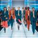 1970er Jahre Minimalistisches Design von bunten Horizental-Linien und Strippes inspiriert durch den lustigen 70er-Stil, mit einem 70er Retro Vintage Farbpalette von blau-gelb-orange und grau aqua für alle nostalgischen Menschen