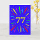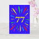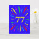 Une carte explosive à 77ème anniversaire ! Quelle merveilleuse façon d'envoyer des salutations d'anniversaire. Le numéro 77 en jaune vif avec une explosion de couleurs vives et d'étoiles.