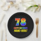 Dieses farbenfrohe, fröhliche und lustige Geburtstags-Thema Papier-Platte-Design zeigt eine große Zahl "78" und die Nachricht "GLÜCKLICH BIRTHDAY", beide mit einem Regenbogenspektrum inspirierten Muster, zusammen mit einem kühnen gelben individuelle Name. Der Hintergrund ist schwarz. So etwas anpassbare Teller könnten bei einem Party zum Feiern des achtundsiebzigsten Geburtstages von jemandem verwendet werden. [~Z0000488]