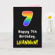 Dieses lustige und fröhliche Geburtstagskarten-Design zeigt die Zahl "7" mit einem farbenfrohen Regenbogenspektrum, inspiriert Farbverlaufsmuster, mit der Meldung "Happy 7th Birthday" und einem anpassbaren Empfängernamen. Im Inneren befindet sich eine individuell angepasste Geburtstagsgrüßbotschaft, oder man könnte sie löschen und leer verlassen werden, wenn eine Nachricht von Hand geschrieben werden soll. Eine mutige, bearbeitbare Geburtstagskarte wie diese könnte eine lustige Art sein, jemandem, der seinen siebten Geburtstag feiert, Geburtstagsgrüße zu schenken. [~Z0000627]