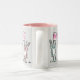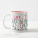 Fun Rabbit Design Mug pour quelqu'un avec un nom de 7 lettres. L'exemple est Melanie. De mignons lapins bébés. Fun rose et blanc Mug avec l'illustration de lapins en rose et bleu. Les lapins tiennent des cartes pour épeler le nom.