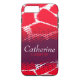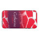 Coque iphone aux motifs animaux clairs dans des tons rouges, blancs et violets audacieux. Personnalisez cette couverture coque avec votre propre nom complet. Exemple actuellement : Catherine Carson. Ce motif original de Sarah Trett, est basé sur le dessin trouvé sur une girafe avec une superposition à mi-teinte de la mémoire point gain motif. www.sarahtrett.com pour www.mylittleeden.com