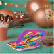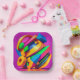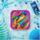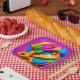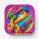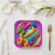 A colorful abstract design covers this 7" square paper plate. This unique design will add color and vibrancy to your party decor!