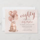 Cette magnifique invitation de fête de 80ème anniversaire avec un gâteau rose à parties scintillant en or 2 couches avec des ballons en or rose, le numéro 80 en or rose sur le rougissement serait parfait pour célébrer votre femme, soeur, ami, maman, tante, grand-mère. Traditionnel et classique, il est frais, moderne et contemporain. Le dos est une jolie feuille d'or rose souple et coordonnée.