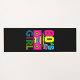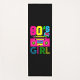 Eine schwarze Yoga-Matte mit einem Design, das lautet "80er Girl in leuchtenden Neonfarben, auf einem hellen Holzfußboden neben einer Flasche mit weißem Wasser. Die "80" ist stilisiert mit der "8" in rosa, die "0" in gelb, und die "S" in blau, mit einer Kassette Grafik integriert. Unten steht das Wort "Mädchen" in grün, blau und gelb, mit jedem Buchstaben in einer anderen Farbe. Zwischen dem "80er" und dem "Girl" befindet sich eine rosa, gelb-blaue Box.