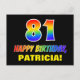 Die Vorderseite dieses fröhlichen, farbenfrohen und lustigen Geburtstags-Thema Postkartendesign zeigt eine große Zahl "81" und die Meldung "HAPPY BIRTHDAY", beide mit einem inspirierten Regenbogenverlauf, zusammen mit einem kühnen gelben, benutzerdefinierten Empfängernamen. Die Vorderseite hat auch einen einfachen schwarzen Hintergrund. Die Rückseite der Postkarte hat eine bearbeitbare Geburtstags-Grußmeldung, oder könnte gelöscht und links werden, wenn eine Nachricht von Hand geschrieben werden soll. Eine lebendige, anpassbare Geburtstagskarte wie diese könnte ein Spaß sein, jemandes 81. Geburtstag zu feiern. [~Z0000474]