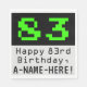 Dieses geeky und nerdy Geburtstagsthema Papier Serviette Design verfügt über eine große grüne 8-Bit-Gaming-Stil-Nummer "83" auf einem schwarzen Hintergrund. Es enthält auch die Geburtstagsgrüßbotschaft "Happy 83. Geburtstag", und einen Namen, der angepasst werden kann. Alberne Papierservietten wie diese könnten in einem Party verwendet werden, das zur Feier des dreiundachtzigsten Geburtstags eines Informatikhistorikers, eines Computerprogrammierers oder jemandem gefeiert wird, der 8-Bit-Videospiele schätzt. [~Z0000404]
