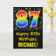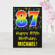 Die Vorderseite dieses lustigen, lebendigen und farbenfrohen Geburtstagskarten-Designs zeigt eine große Zahl "87" mit einem inspirierten Regenbogenspektrum-Gefälle, zusammen mit der Meldung "Happy 87 th Birthday" und einem bearbeitbaren Empfängernamen. Die Vorderseite weist auch ein Farbmuster mit verschiedenen Musiknoten und Symbolen in verschiedenen Farben und Größen auf. Im Inneren befindet sich eine benutzerdefinierte Geburtstagsgrüßbotschaft, oder man könnte sie löschen und leer verlassen werden, wenn eine Nachricht von Hand geschrieben werden soll. Eine individuell anpassbare Geburtstagskarte wie diese könnte eine lustige Art sein, jemandes siebenundachtzigsten Geburtstag anzuerkennen. [~Z0000420]