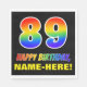 Dieses farbenfrohe, lustige und fröhliche Geburtstagspapier serviert eine große Zahl "89" und die Meldung "HAPPY BIRTHDAY", beide mit einem inspirierten Regenbogenspektrum-Farbverlauf, zusammen mit einem kühnen gelben personalisierten Empfängernamen. Der Hintergrund ist schwarz. Spaß, individuell gestaltbare Geburtstagskopfservietten wie diese können auf Jemandes 89. Geburtstagsfeier verwendet werden. [~Z0000476]
