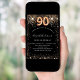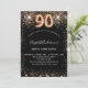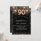 Eine moderne, stilvolle und glamouröse Einladung zu einer 90. Geburtstagsfeier. Ein schwarzer Hintergrund mit goldenem Imitat Glitzer, Glitzern. Der Name ist mit einem modernen handgeschriebenen Stilskript geschrieben. Personalisieren Sie Ihre Party-Daten und fügen Sie sie hinzu. Nummer 90 wird mit einem Schriftart im Ballonstil geschrieben, Skript.