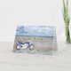 Ein blauer Motorrad stehend auf einem Strand mit flauschigen Wolken am Himmel. Alles Gute zum Geburtstag geschrieben in Stein reflektiert im Wasser auf dem Sand.