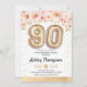90. Geburtstagsfeier Einladung. Elegantes Design in Imitaten Glitzer Gold mit Blumenakzent. Einladende Karte mit Goldnummer 90 Ballons, Skript-Schriftart mit Konfetti. Rosa, weiß, blaue Koralle. Ideal für eine stilvolle Feier am neunzigsten Tag. Nachricht, wenn du ein Alter brauchst.
