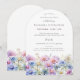 Elegante Aquarellbilder schaffen am Ende dieser bogenförmigen Einladung einen Blumenrand. Die lila, pinkfarbenen, blauen und weißen Blume sind die Blume des Septembermonats, die das passende Motiv für Ihren Geburtstag im September darstellt.