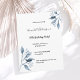 Un invitation de fête du 90ème anniversaire, élégant et simple. Devant un arrière - plan blanc et chic décoré de branches botaniques bleues, des fleurs. Modèles pour un nom, âge 90 et les détails de votre fête. Dos : couleur arrière - plan bleue classique. Conseil : Si vous ne voulez pas qu'il ressemble à une carte postale, cliquez sur customiser, allez à l'arrière et retirez le séparateur et le timbre postal.