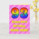 Die Vorderseite dieses lustigen und optimistischen 93. Geburtstags Thema Grußkarte Design hat eine große Zahl "93" mit einem bunten Muster inspiriert durch das Aussehen eines Regenbogenspektrums. Es enthält auch die Meldung "Happy 93. Geburtstag", und einen bearbeitbaren Empfängernamen. Der Hintergrund der Vorderseite weist ein Muster aus dunkelrosa und hellrosa Streifen mit liebevollen rosa Herzformen auf. Im Inneren befindet sich eine bearbeitbare Geburtstags-Grußnachricht, oder man könnte sie löschen und leer verlassen werden, wenn eine Nachricht von Hand geschrieben werden soll. Eine individuell gestaltbare Geburtstagskarte wie diese könnte eine lustige Art sein, Geburtstagswünsche an jemanden zu senden, der gerade seinen dreiundneunzigsten Geburtstag feiert. [~Z0000416]