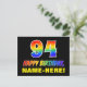 Die Vorderseite dieses fröhlichen, farbenfrohen und lustigen Geburtstags-Postkartendesigns zeigt eine große Zahl "94" und die Meldung "HAPPY BIRTHDAY", beide mit einem Regenbogenspektrum inspirierte Musterfärbung, zusammen mit einem kühnen gelben personalisierten Empfängernamen. Die Vorderseite weist auch einen schlicht schwarzen Hintergrund auf. Auf der Rückseite der Postkarte befindet sich eine individuell anpassbare Geburtstagsgrüßnachricht, oder sie könnte gelöscht und leer verlassen werden, wenn eine Nachricht von Hand geschrieben werden soll. Eine so aufregende, anpassbare Geburtstagskarte könnte eine lustige Art sein, eine Nachricht zu senden, die den vierundneunzigsten Geburtstag von jemandem feiert. [~Z0000474]