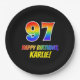 Dieses fröhliche, farbenfrohe und lustige Geburtstagsschild-Design zeigt eine große Zahl "97" und die Meldung "HAPPY BIRTHDAY", beide mit einem inspirierten Regenbogenspektrum-Farbverlauf, zusammen mit einem kühnen gelben individuelle Name. Der Hintergrund ist schwarz. Geburtstagsthematische Teller wie diese könnten bei einem Party zum 97. Geburtstag von jemandem verwendet werden. [~Z0000488]