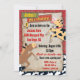 Cute et moderne ferme ou grange invitations à la fête d'anniversaire avec un cheval et la vache, des graphiques amusants, une cloche à la sonnette pour placer l'âge de votre enfant sur vieux papier contre le bois de grange rouge et motif de vache arrière - plan. Illustration tirée à la main par McBooboo. N'hésitez pas à me contacter pour tout problème ou travail personnalisé !