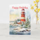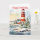 A red and white lighthouse in winter. Suitable for a birthday for anyone