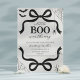 This design features Halloween baby shower theme "A Little Boo Is On The Way" with black bow and spooky spiders webs and spiders and flying bats to give it a cute but spooky Halloween vibe. Perfect for gender neutral baby shower in grey and black colors.