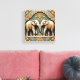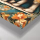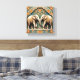 Two elephants stand side by side, their trunks intertwined, in front of a stylized tree with orange flowers. The elephants are decorated with similar floral patterns in shades of orange and gold. The background is a mosaic of blue tiles, with an archway above the elephants also adorned with orange flowers and foliage.