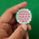 A poker chip with a floral pattern in pink and green with geometric accents on both sides, creating a vibrant and playful design.