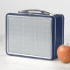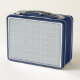 A rectangular blue and white lunchbox with a geometric hexagonal pattern on both front and back, shown from two angles. The design is modern and sleek.
