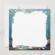 A sea turtle themed notecard that is blank on one side and has an illustration of a sea turtle under a calm teal sea swimming among the coral on the front.