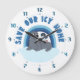 A large clock with a cute illustration of a happy cheerful penguin sitting atop of a seal, with a blue rainbow and a text saying "Save Our Icy World" over them. This is a perfect present for people who care about our wonderful nature and beautiful planet.