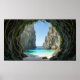 This image depicts a secret cove accessible only through a narrow, vine-covered sea cave. The water inside is an impossibly bright turquoise. Jagged cliffs frame the pristine beach in a highly detailed digital matte painting with Art Nouveau influences.