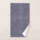 A set of purple towels with a diamond pattern hangs on a metal rod. Below, one towel is laid flat with a folded corner revealing a white underside.