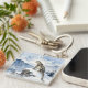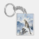 A pretty wildlife Keychain with an illustration of a majestic snow leopard perched on a craggy, snow-covered peak, gazing out at a vast, frozen mountain range.