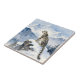 A pretty wildlife ceramic tile with an illustration of a majestic snow leopard perched on a craggy, snow-covered peak, gazing out at a vast, frozen mountain range.