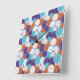 A square wall clock with overlapping clock faces in orange, purple, and teal patterns, featuring black hour and minute hands in the center. The design gives a vibrant, busy feel.